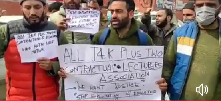 Srinagar Feb 20 (PTK) :Demanding continuation of service and comprehensive job policy, 10+2 contractual lecturers from different parts of the Valley hit streets Monday to protest against the government’s alleged “use and throw” policy.