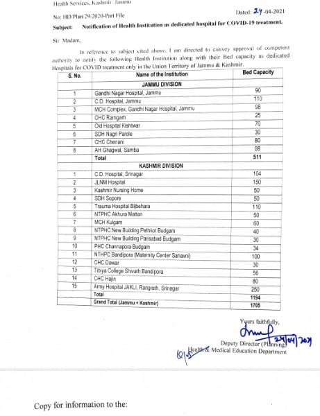 “In reference to to subject cited above. I am directed to convey approval of competent authority to notify the following Health Institution along with their Bed capacity as dedicated Hospitals for COVID treatment only in the Union Territory ofJammu & Kashmir,” it reads.