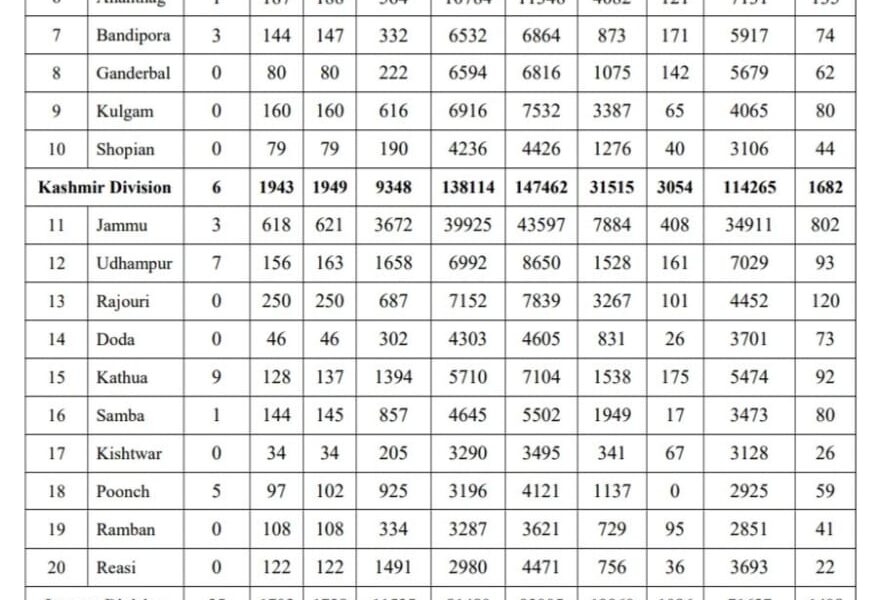 Dividing the cases district wise, it mentioned that 404 cases were reported from Srinagar, 129 from Baramulla, 262 from Budgam, 390 from Pulwama, 110 from Kupwara, 188 from Anantnag, while Bandipora 147, Ganderbal 80, Kulgam 160, Shopian 79, Jammu 621, Udhampur 163, Rajouri 250, Doda 46, Kathua 137, Samba 145, Kishtwar 34, Poonch 102 Ramban 108 and Reasi 122.