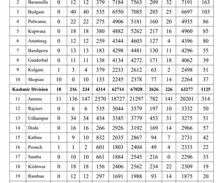 Dividing the cases district wise, it mentioned that 92 cases were reported from Srinagar, 12 from Baramulla, 40 from Budgam, 22 from Pulwama, 18 from Kupwara, 12 from Anantnag while Bandipora reported 13, Ganderbal 11 , Kulgam 04, Shopian 10, Jammu 147, Rajouri 06, Udhampur 34, Doda 16, Kathua 10 ,Poonch 02, Samba 10, Kishtwar 18,Ramban 12 And Reasi 12.
