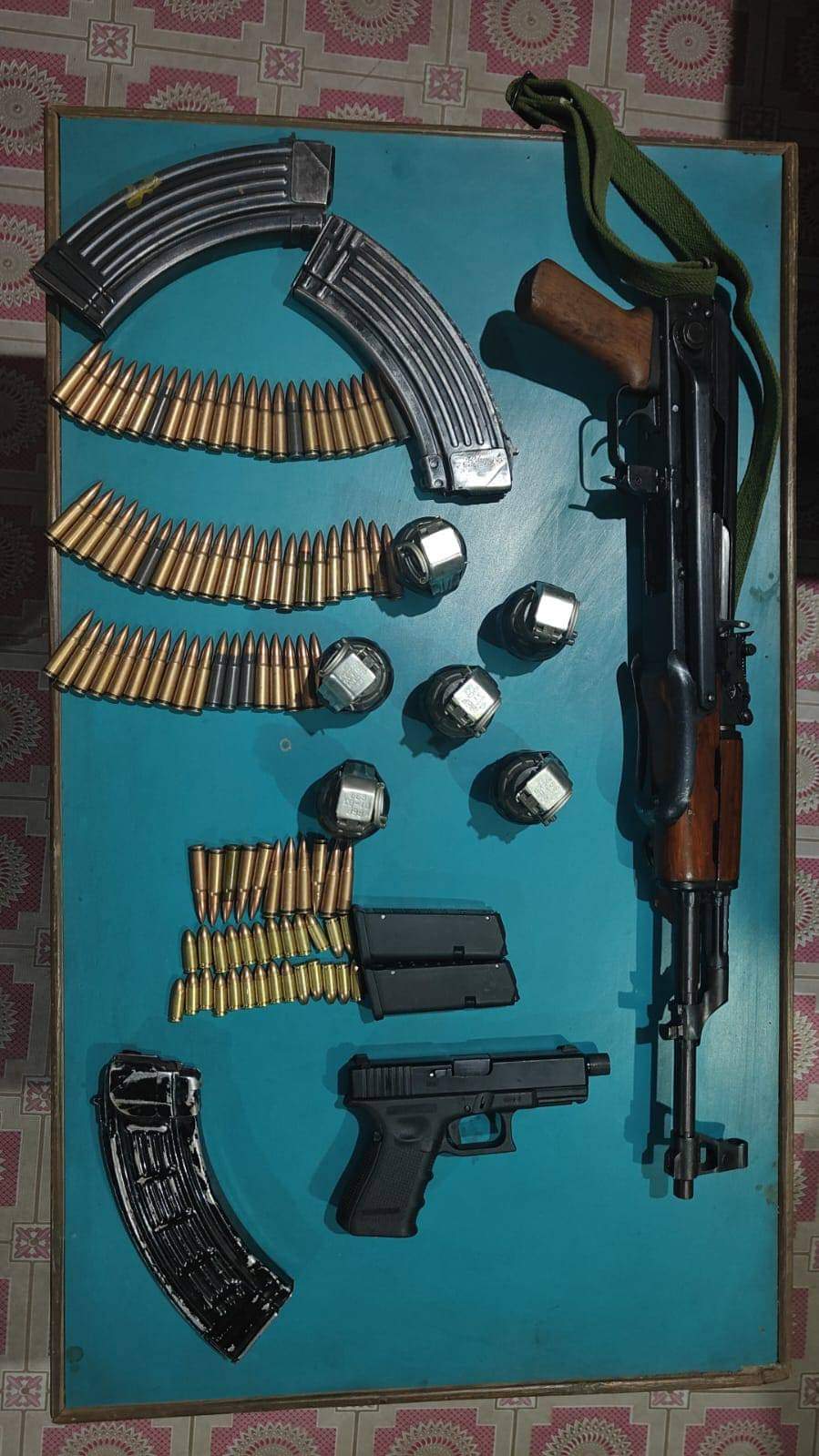 The operation yielded a significant cache of incriminating materials, arms, and ammunition, including an AK 56 rifle with three magazines, 75 rounds of 7.62 x 39 mm ammunition, a Glock pistol with two magazines, 26 rounds of 9 mm ammunition, and six Chinese grenades.