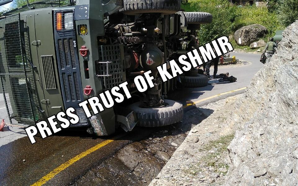 Army vehicle turns turtle in Kangan
