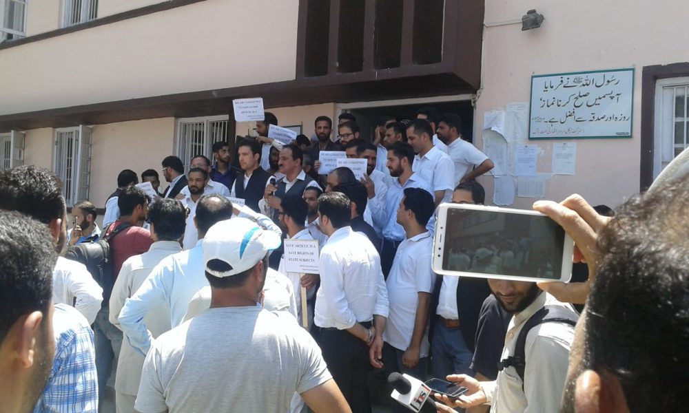 SRINAGAR, (PTK): Several members of Bar Association Anantnag staged a peaceful protest against the ‘attempts’ to abrogate Article 35-A of the constitution that confers special rights on the permanent residents of Jammu and Kashmir.