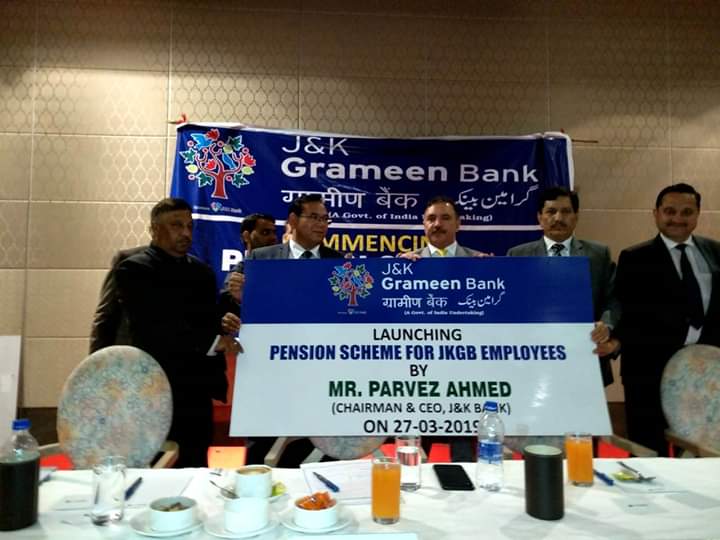 SRINAGAR, (PTK): Chairman & CEO, J&K Bank Parvez Ahmed today launched the pension scheme for the employees of J&K Grameen Bank during an event organized at Hotel Radisson Blu, Jammu in presence of Executive President J&K Bank R.K. Chhibber, President J&K Bank Sunil Gupta, Chairman Grameen Bank Janak Raj, General Managers Grameen Bank and a number of serving and retired employees of the J&K Grameen Bank.