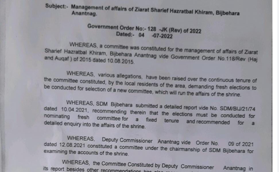 “A committee was constituted for the management of affairs of Ziarat Sharief Hazratbal Khiram, Bijbehara Anantnag vide Government Order No.118/Rev (Haj and Augaf) of 2015 dated 10.08.2015 and various allegations, have been raised over the continuous tenure of the committee constituted, by the local residents of the area, demanding fresh elections to be conducted for selection of a new committee, which will run the affairs of the shrine, SDM Bijbehara submitted a detailed report vide No. SDM/BIJ/21/74 dated 10.04.2021, recommending therein that the elections must be conducted for nominating fresh committee for fixed tenure and recommended for a detailed enquiry into the affairs of the shrine.” reads an order issued by Vijay Kumar Bidhuri, commissioner secretary to Government, a copy of which lies with PTK
