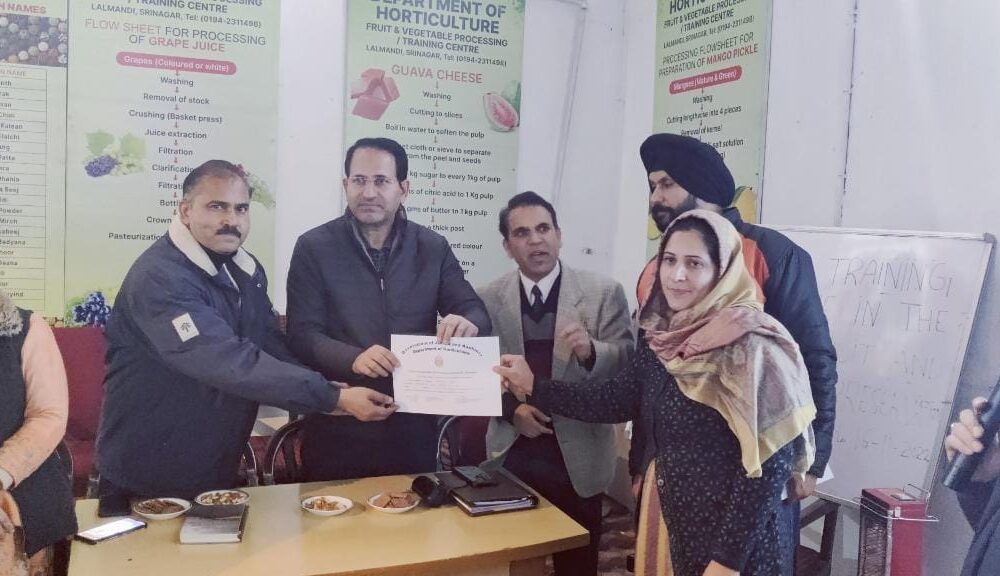 PRESS TRUST OF KASHMIR SRINAGAR, NOVEMBER 16: The Director, Horticulture Kashmir, G. R. Mir today felicitated the trainees with certificates, who were imparted training on Canning and Preservation of Fruits and Vegetables (C&PoFV) at Fruit and Vegetable Crop Centre, Department of Horticulture, Srinagar.