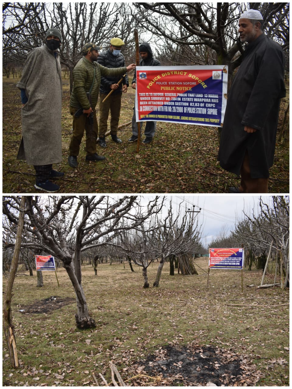 SRINGAR 20(PTK): Police in Sopore have attached 4 kanals and 2 marlas of orchard land belonging to two proclaimed offenders namely Afroz Ahmad War son of Mohammad Maqbool War and Maqsood Ahmad War son of Sona-u-llah War, both residents of Warpora Sopore under Survey numbers 3225, 3950, 3956 and 2384 in Estate Warpora Sopore.