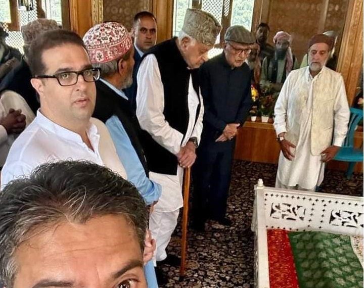 SRINAGAR (PTK): The Jammu and Kashmir National Conference President and Member of Parliament from Srinagar Dr. Farooq Abdullah on Friday paid obeisance at the revered Shrine of Hazrat Baba Mian Nizam-ud-Din Qiyanvi Naqshbandi (RA) at Baba Nagri Kangan on the occasion of the annual 127th Urs Mubarak. He was received by senior party leader and Sajjada Nasheen of the shrine Mian Altaf Ahmad.