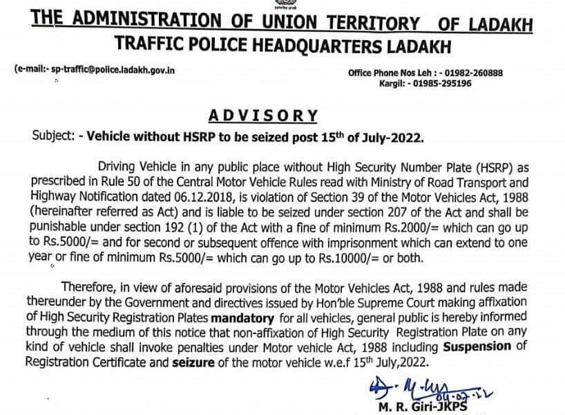 Every vehicle without HSRP to be seized in Ladakh after 15 July