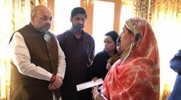 Amid tight security arrangements, Shah visited the family at around 9:15 am alongside top Home Ministry officials. Shah assured Arshad’s wife and father of government’s assistance and also played with the martyr’s two little children. He later offered a job to the martyr’s wife.