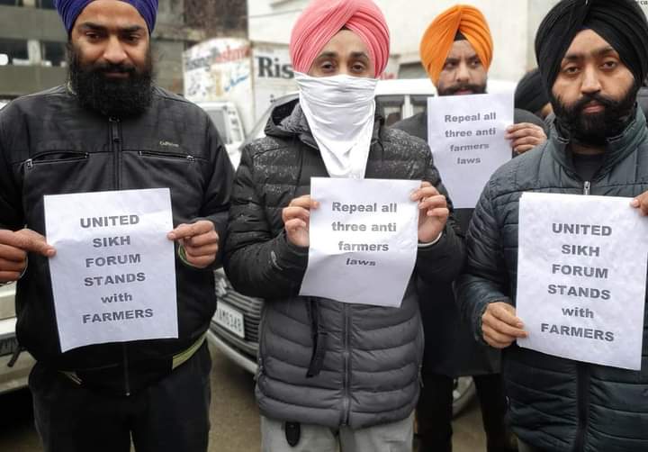Sarinagar Dec, 08 (PTK) United Sikh Forum (USF) on Tuesday staged a protest in solidarity with the ongoing farmers agaitation across the India
