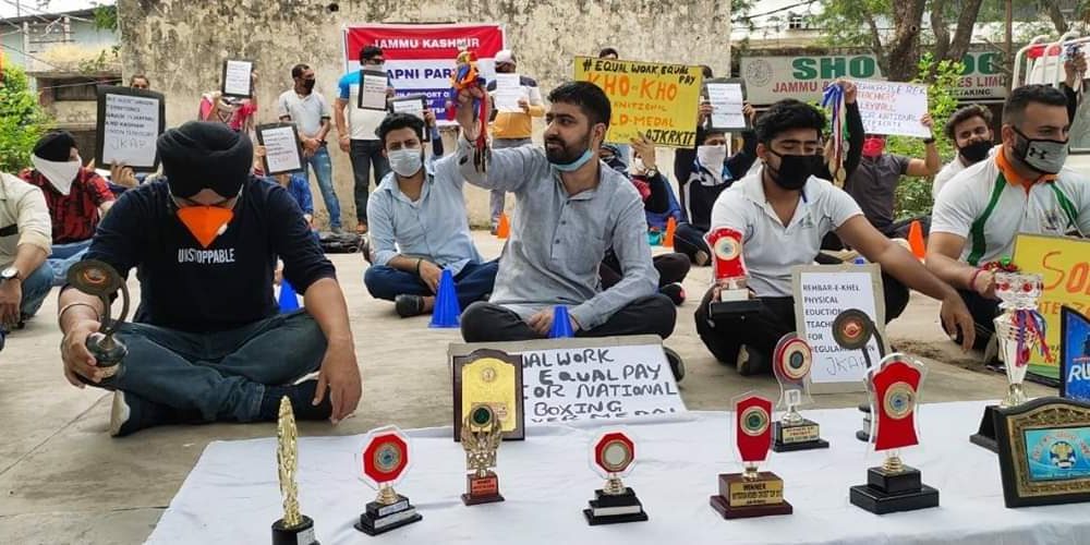 Led by J&K Apni Party, senior youth leader, Raqeeq Ahmed Khan, the protesters assembled at the exhibition ground near Jammu’s Press Club, the physical teachers staging a symbolic protest demonstration in support of their demands.