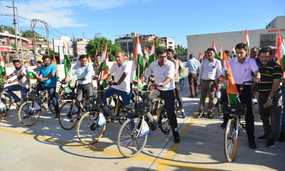 PRESS TRUST OF KASHMIR JAMMU, AUGUST 12: Whipping up the patriotic fervour, scores of people participated in cycle Tiranga rally organised by Jammu Municipal Corporation (JMC) in collaboration with Jammu Smart City Limited (JSCL) on Friday as a part of Azadi ka Amrit Mahotsav to celebrate 75th anniversary of Independence.