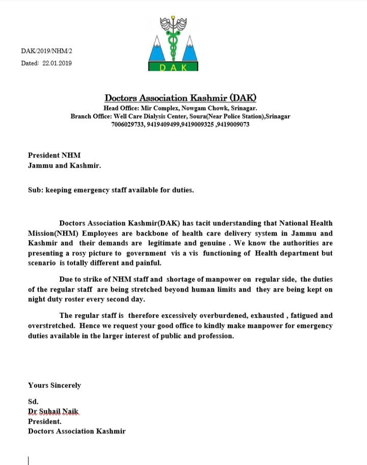 SRINAGAR, (PTK): Doctors association Kashmir (DAK) has tacit understanding that national health mission (NHM) employees are backbone of the Health care delivery system in Jammu and Kashmir and their demands are legitimate and genuine. We know the authorities are presenting a rosy picture to government vis a vis functioning of Health department but serious is totally different and painful.