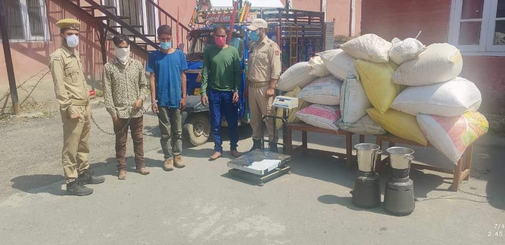 Police party of Police Station Kulgam led by SHO Kulgam Insp. Jazib Mohammad alongwith PSI Abdul Lateef under the supervision of I/C DySP HQR Kulgam Shri. Sheikh Tahir Amin-JKPS established a Naka near Balsoo crossing and during checking one Vehicle (Load carrier) bearing registration number JK18A-1048 was stopped and during checking officers present were able to recover 130 Kg of Poppy Straw like substance, Two Grinding machines, One Digital weighing machine from the possession of three persons whose identity has been ascertained as; Mushtaq Ahmad Mir S/O Ali Mohd Mir, Iqbal Ahmad Ganie S/O Ghulam Mohammad Ganie residents of Buchroo and Reyaz Ahmad Dar S/O Mohd Khalil Dar resident of Brazloo. They were arrested also vehicle, contraband substance and Equipments recovered were seized