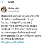 “Markets/business establishments of district shall remain closed for next 3 days(Fri, sat, sun) except medical/Milk/Veg shops. Public & Pvt transport shall also remain suspended except med emergencies.All govt offices/ banks to remain functional,” He Tweeted(PTK)