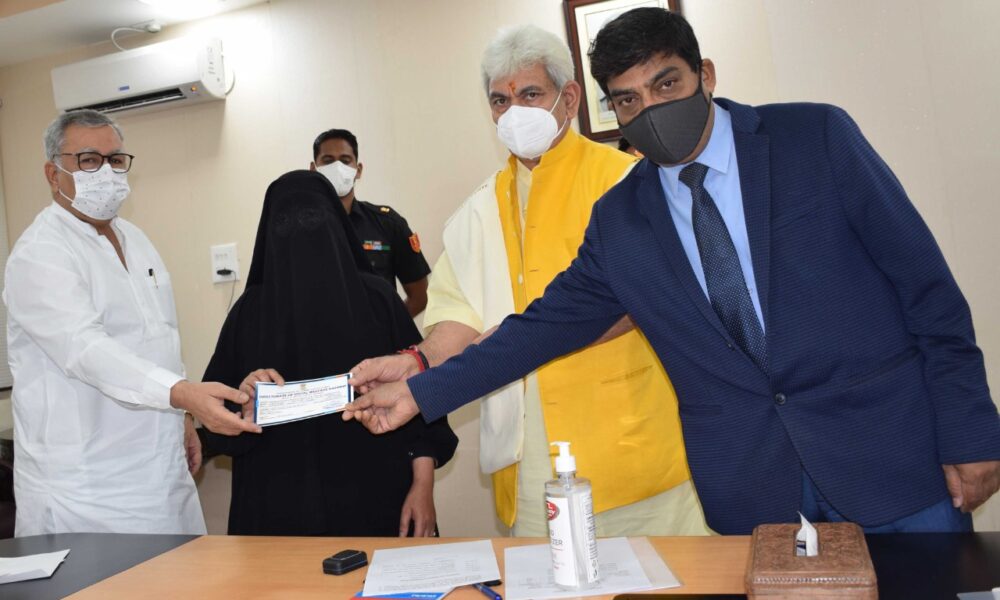 Press Trust of Kashmir | SRINAGAR : Lieutenant Governor, Manoj Sinha today rolled out ‘Special Assistance Scheme for COVID Mortalities – SASCM’ (सक्षम), by handing over the grant of Scholarship and Pension certificates to the children and the members of the families affected due to COVID-19.