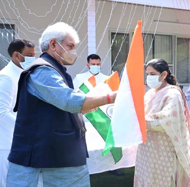 PRESS TRUST OF KASHMIR SRINAGAR, AUGUST 13: Lieutenant Governor Manoj Sinha today started the Har Ghar Tiranga campaign in Jammu Kashmir by distributing National flags among the Raj Bhawan staff here.