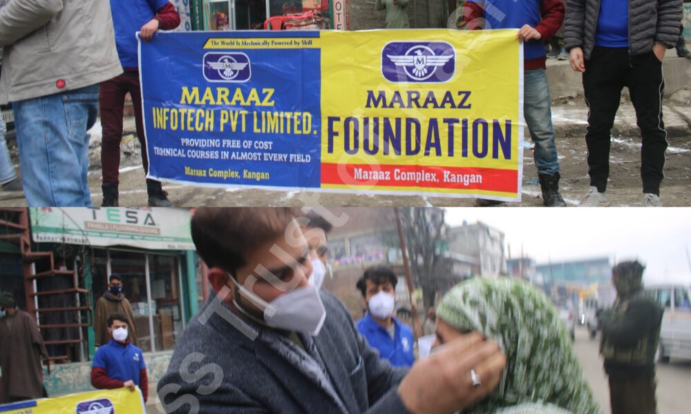 Ganderbal, 17 Jan (PTK) :Amid the surge in covid cases, Maraaz Infotech Pvt limited and Maraaz foundation in collaboration with Police station Kangan organised an awareness programme on covid in Kangan market of central Kashmir’s Ganderbal district here on monday.