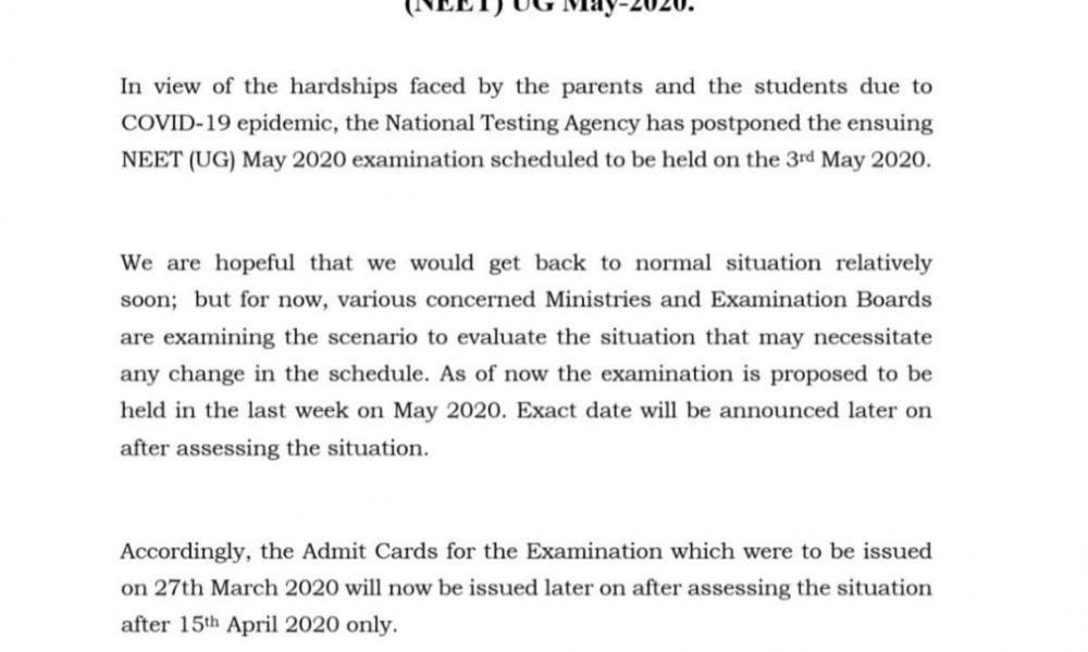 With this NEET is the second major exams to have been postponed due to the nationwide lockdown due to COVID-19 outbreak after JEE mains
