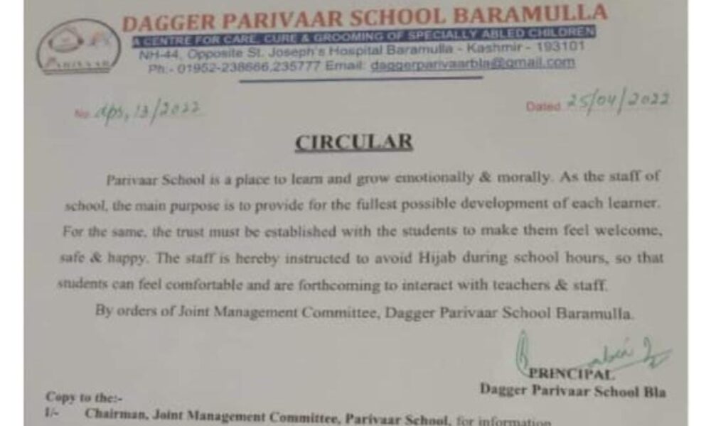 “Parivaar School is a place to learn and grow emotionally & morally. As the staff of school, the main purpose is to provide for the fullest possible development of each learner. For the same, the trust must be established with the students to make them feel welcome, safe & happy. The staff is hereby instructed to avoid Hijab during school hours, so that students can feel comfortable and are forthcoming to interact with teachers & staff.” Reads the circular issued by School. (PTK)