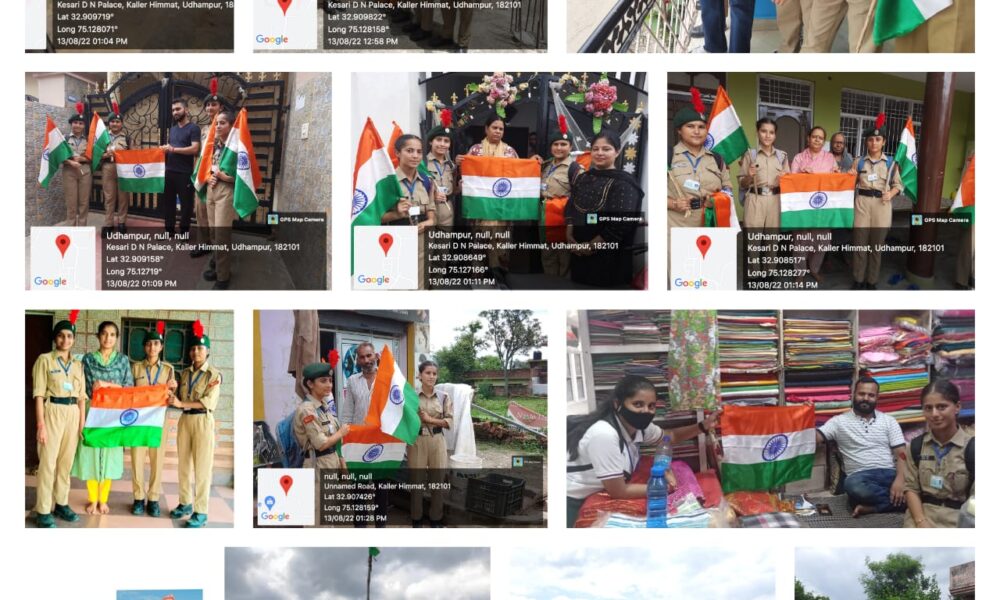 PRESS TRUST OF KASHMIR UDHAMPUR AUGUST 14: The First J&K Girls Battalion NCC Srinagar, Government College for Women, Udhampur other day conducted door to door distribution of National flags to promote Har Ghar Tiranga campaign to mark the celebration of Independence week under the aegis of Azadi Ka Amrit Mahotsav.