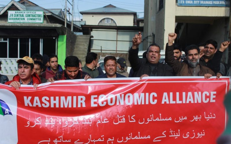 Srinagar, (PTK): Kashmir Economic Alliance held a protest in Srinagar to express solidarity with the Muslims who were targeted by the terrorists in two mosques of New Zealand.
