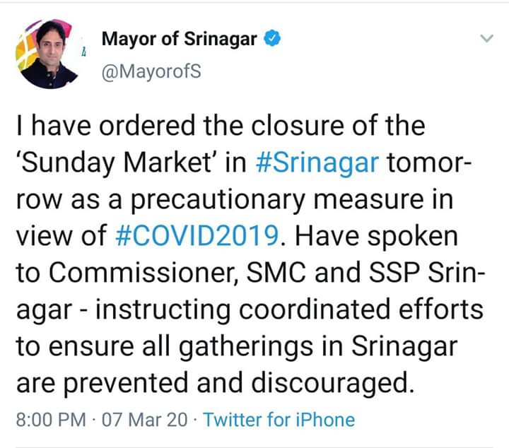 No ‘Sunday Market’ tomorrow in Srinagar: Junaid Mattu Smc mayor
