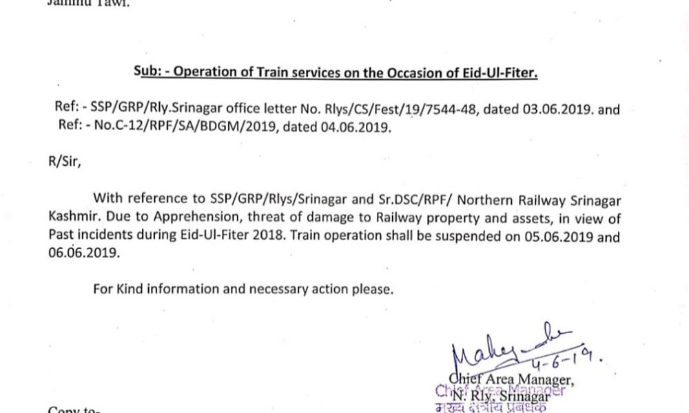 On eve of Eid train service remains suspended in Kashmir tomorrow