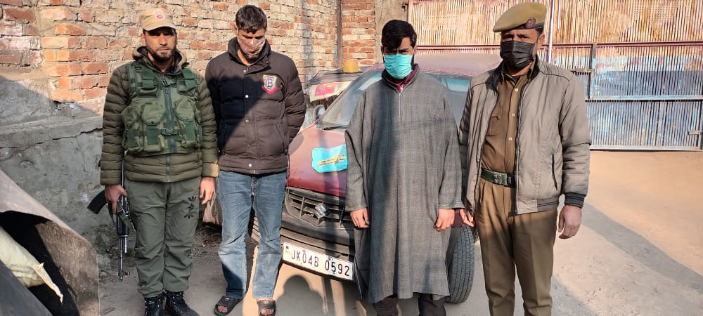 A Police party of Police Station Khansahib at a checkpoint established at Wagar Khansahib intercepted a vehicle (Alto-800) bearing registration number JK04B-0592 with two persons onboard. They have been identified as Riyaz Ahmad Dar son of Wali Mohd resident of Khari Bagh Gopal Saif Chadoora and Mohd Altaf Rather son of Mohd Akbar resident of Chill Panzan Chadoora.