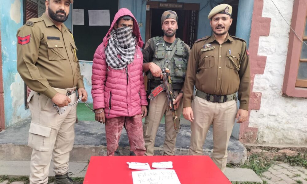 A Police party of Police Station Kangan at a checkpoint established at Iqbal Abad Kangan, arrested a drug peddler identified as Muzaffar Ahmad Jagal son of Nazir Ahmad Jagal resident of Naranag, Kangan. During search, contraband substance was recovered from his possession. He has been shifted to police station where he remains in custody.