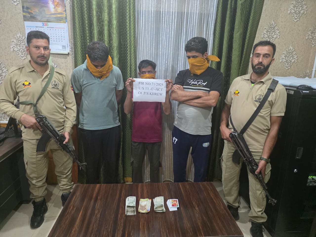 Acting on a specific information regarding gambling activities in Khrew area, a police party of Police Station Khrew headed by SHO PS Khrew under the supervision of SDPO Pampore raided the specific spot and arrested three gamblers. They have been identified as Mukhtar Ahmad Shah son of Gh Ahmad Shah resident of Panthachowk Srinagar, Showkat Ahmad Ganie son of Gh Mohd Ganie resident of Dangarpora Nowgam Srinagar and Manzoor Ahmad Guroo son of Mohd Sultan Guroo resident of Sambarbugh Nowgam Srinagar.