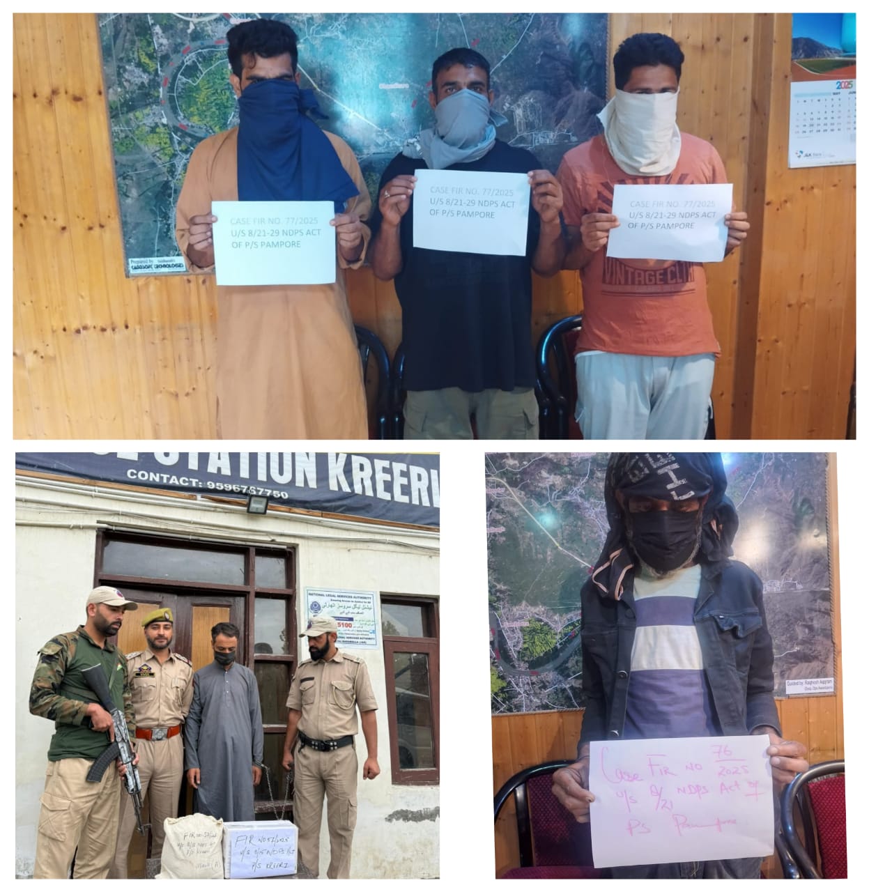 Srinagar, July 15(PTK): In continuation of its sustained efforts to eradicate the menace of drugs from society, Police have arrested five drug peddlers in Awantipora & Baramulla and recovered contraband substances from their possession.