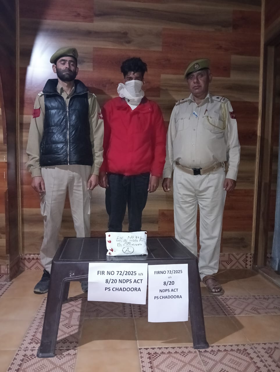 A Police party of Police Station Chadoora at a checkpoint near Higher Secondary School Zohama, intercepted a suspicious person identified as Sajad Muzaffar Ahmad Dar son of Ghulam Mohammad Dar resident of Surasyar Chadoora. During search, Charas sticks weighing about 270 grams was recovered from his possession. Subsequently, he was arrested and a case vide FIR No.72/2025 under relevant sections of law has been registered at Police Station Chadoora and investigation has been initiated.