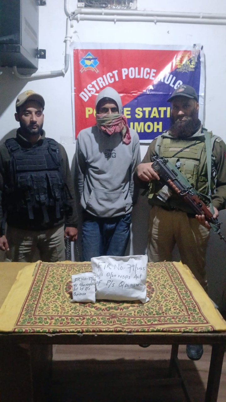A Police party from Police Station Qaimoh at a checkpoint established at Khudwani Bypass arrested a drug peddler identified as Talib Hussain Sheikh son of Khurshid Hussain Sheikh resident of KG Raina, Wanpoh. During search, 30 grams of charas and 500 grams of grinded cannabis-like substances were recovered from his possession.