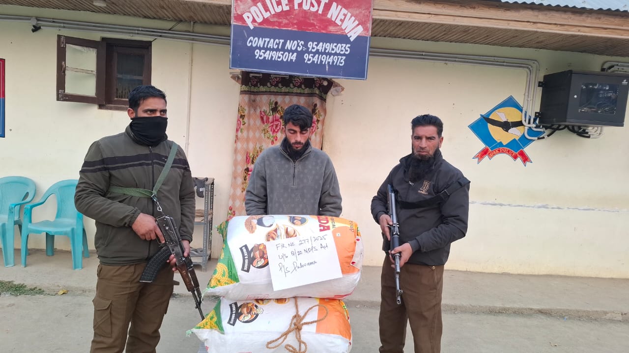 A Police team a checkpoint established at Newa Pulwama, intercepted an individual identified as Rafiq Ahmad Shah son of Bashir Ahmad Shah resident of Newa Pulwama. During search, 16.5 kilograms of Charas powder–like substance was recovered. Subsequently, he has been arrested.