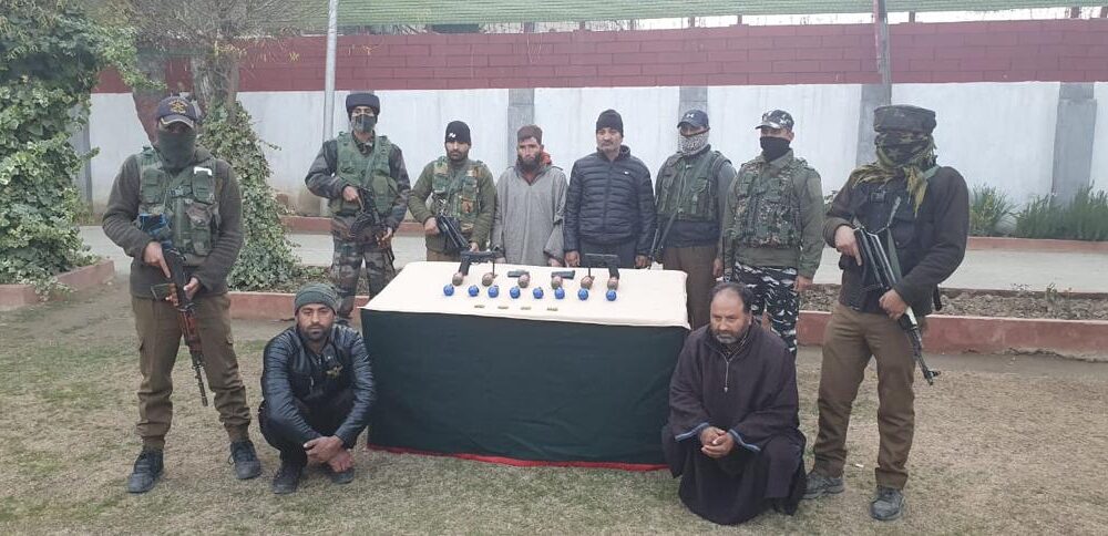 Press Trust Of Kashmir Srinagar November 28: In a major break-through against terrorists infrastructure in Kashmir Valley, Sopore Police alongwith 22 RR busted AGuH module by arresting AGuH Handler of North Kashmir, 4 OGWs cum terrorist associates in Sopore. Incriminating materials, huge cache of arms and ammunition have been recovered from their possession, thereby giving a huge setback to the organisation operatives and thus averting a major tragedy. Besides, arms & ammunition was recovered in Awantipora.