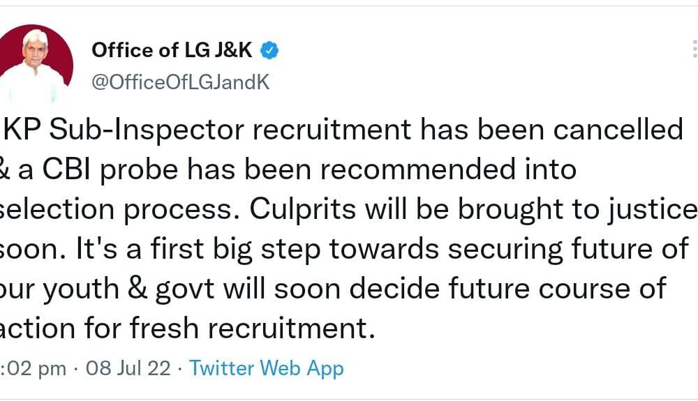 “JKP Sub-Inspector recruitment has been cancelled & a CBI probe has been recommended into selection process. Culprits will be brought to justice soon. It’s a first big step towards securing future of our youth & govt will soon decide future course of action for fresh recruitment, ” LG Manoj Sinha wrote in a tweet.