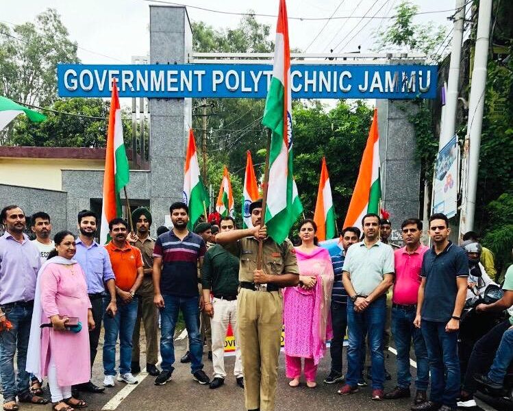 PRESS TRUST OF KAHSMIR JAMMU, AUGUST 05: Er. Ritu Jamwal, Principal Government Polytechnic Jammu, today flagged off “Har Ghar Tiranga” Rally (PADYATRA) of staff and students here in presence of HODs of different departments of the institution to commemorate 75′ Year of Independence under AZADI KA AMRIT MAHOTSAVA- the Government of India’s initiative to inculcate the national values of oneness, harmony and universal brotherhood and to amplify a personal connection between the citizens of India and the National Flag.