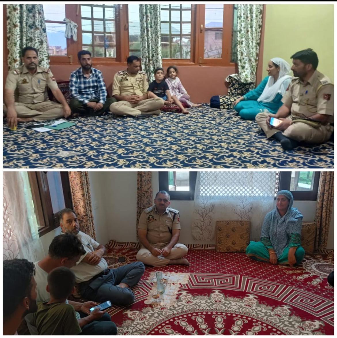 August 13: To express solidarity and to perceive the wellbeing of the families of Police Martyrs, senior officers today visited these families in Anantnag, Srinagar & Awantipora.In Anantnag, Police paid heartfelt visits to the families of Police Martyrs residing within the jurisdictions of PS Mattan, PS Srigufwara, and Police Post D.K. Pora. SP Hqrs Anantnag, accompanied by SHO Mattan, visited the homes of martyrs’ families, distributing sweets and gifts to the next of kin (NOKs). Similarly, SHO Srigufwara and DO D.K. Pora also visited the families of Police martyrs, offering their condolences. Similarly, in Awantipora, SSP Awantipora Ajaz Ahmed Zargar-JKPS accompanied by Addl SP Awantipora Rashid Yunus and SDPO Pampore visited Police martyr families at village Dogripora Awantipora and Ladhoo Pampore.
