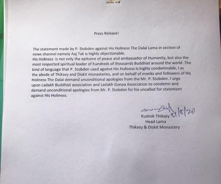 The statement made by P. Stobden against His Holiness The Dalai Lama in section of news channel namely Aaj Tak is highly objectionable, reads press release issued by Kushok Thiksey.