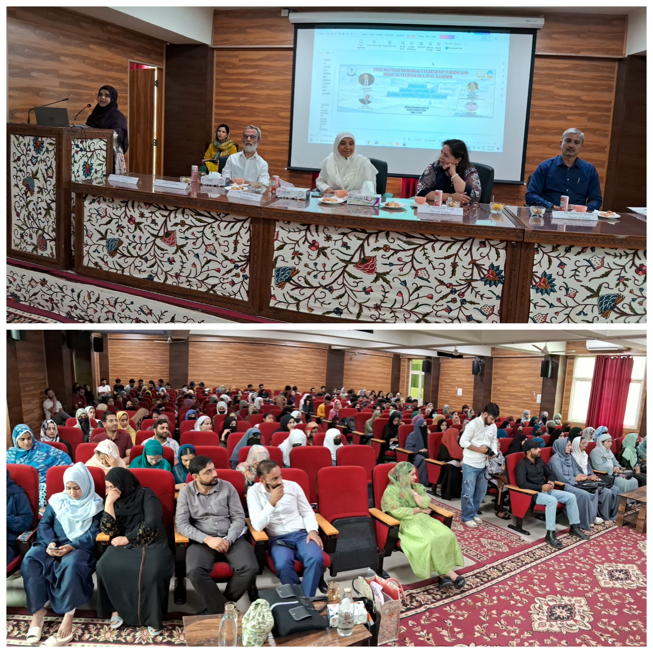 Awantipora, 6 Aug: Syed Mantaqui Memorial College of Nursing and Medical Technology, IUST, Awantipora hosted a special lecture by Dr. Manjulata Evatt on 6th August, 2024 at Auditorium Academic Block III of IUST. The theme for this special lecture “Global Nursing: Education Opportunities in America,” highlighted the significance and pathway of achieving quality education outside India.