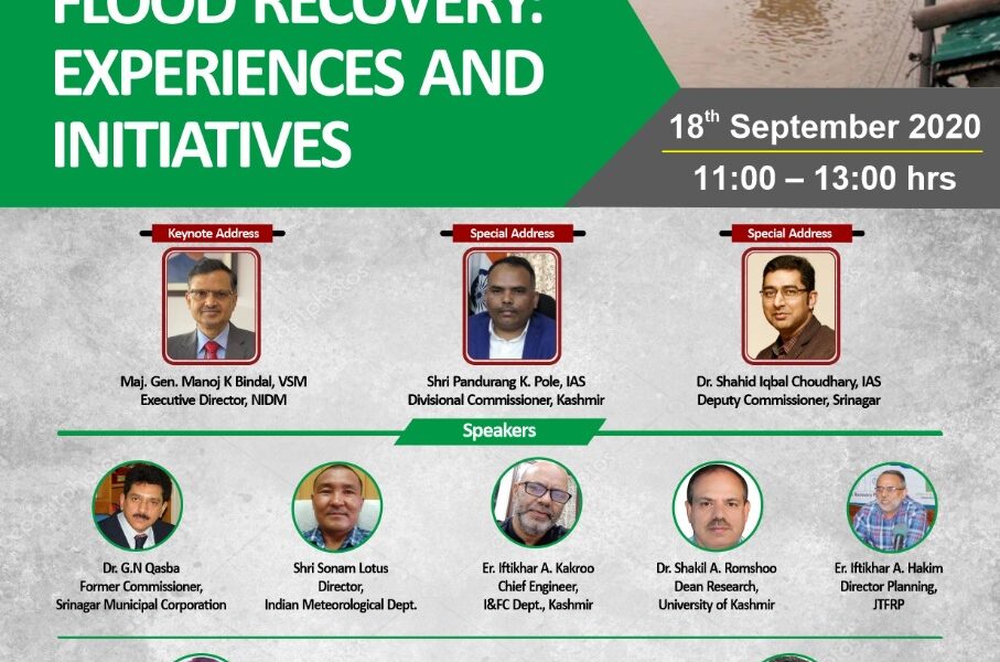 Srinagar September 18 (PTK) In connection with the 6th Anniversary of the September 2014 Floods, a Webinar on 2014 Kashmir Flood Recovery: Experiences and Initiatives was jointly organized by National Institute of Disaster Management (NIDM) & The Institution of Engineers, India (IEI), Jammu & Kashmir State Centre, in collaboration with the Divisional Administration, Kashmir.